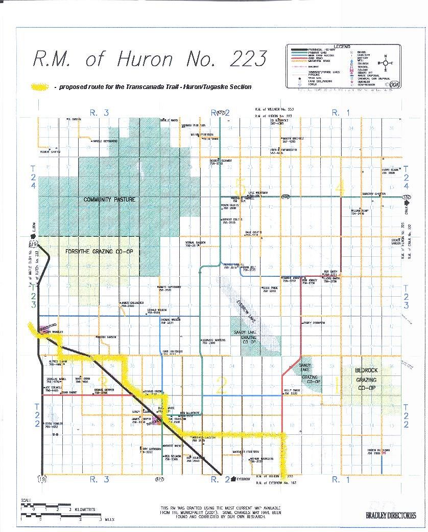 ![]() ![]() Highlighted on the map is the proposed route of the trail in the R.M. of Huron. For more information about the Trans Canada Trail, visit the Trans Canada Trail website at http://www.tctrail.ca/